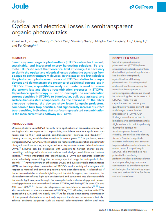 Next Cheng Pei/Wang Jiayu/Yan Cengqi’s team made a series of progress in translucent organic photovoltaic