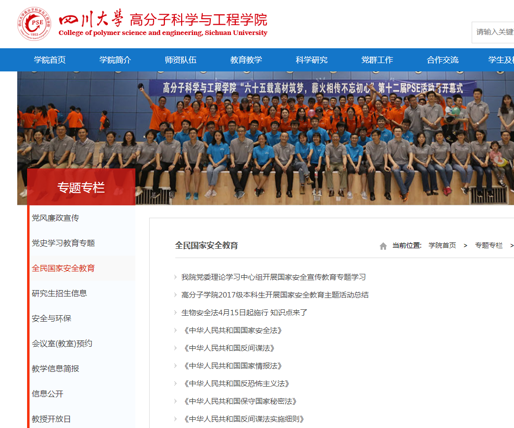 学院在官网增设“4.15全民国家安全教育”专栏,宣传相关法律法规宣传相关法律法规,如《国家安全法》、《网络安全法》、《核安全法》《反恐怖主义法》、《反间谍法》、《生物安全法》等法律法规。此外,学院党政办专门将国家安全相关法律法规列入双周教职工政治学习计划与党组织生活学习计划中,增强师生维护国家安全的意识和能力。