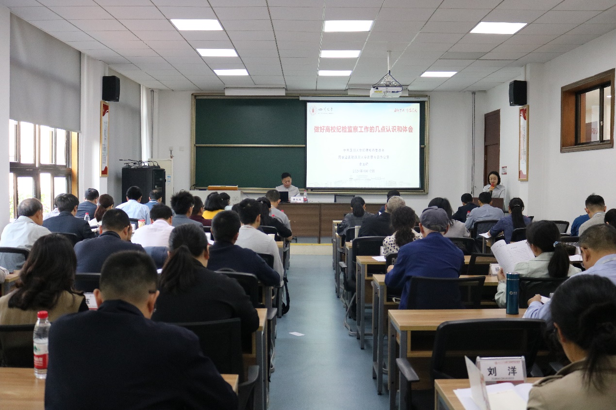 校纪委副书记、三级高级监察官李玉峰以《做好高校纪检监察工作的几点认识和体会》为题,介绍了纪委的基本职能职责和主要任务,厘清了一些认识误区,从形势任务怎么看、高校纪检怎么办、二级纪委怎么干三个方面,结合自身工作经历和学校纪检监察工作实践进行授课。