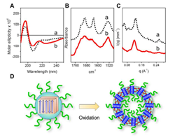 图1. 聚合物自组装体氧化前后的化学结构和构象表征,以及自组装机理示意图
