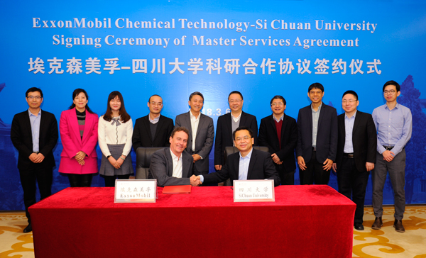 科学技术发展研究院院长褚良银与埃克森美孚全球基础产品研究经理Chip Wittenbrink代表双方签订了科研合作协议。根据协议,双方将在高分子复合物加工领域展开为期5年、总预算为1500万元的校企合作研究服务协议,这是埃克森美孚目前与中国高校合同经费最大的一项科技合作协议。