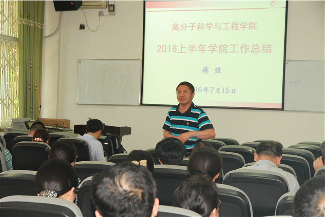 首先傅强教授代表学院领导班子作2016上半年工作总结,汇报了学院在党群工作、本科与研究生教学、学生工作、科学研究、实验室建设、人事工作等方面取得的成绩,并对下半年的工作进行了部署和安排。副院长李忠明教授和赵长生教授分别作2015年的科研工作总结和教学工作总结,并进行了教学科研表彰。学院党委副书记李艳梅同志简要介绍了近期学生就业、本科生导师制实施、招生录取等方面的情况。副院长钱祉褀同志强调了实验室大型仪器管理和安全防洪的问题。