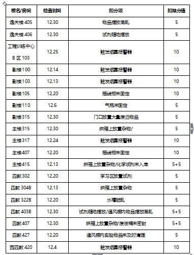 (1)依据《高分子学院安全与环保工作管理规定》,12月份实验室扣分情况如下:
