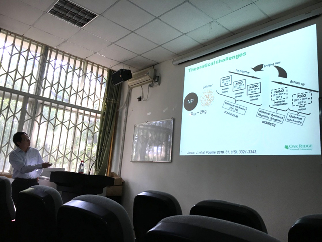 报告中,程博士就其在聚合物纳米复合材料领域所开展的工作进行了介绍,介绍了聚合物纳米复合材料界面层的结构和性能的表征新手段,阐述了聚合物相对分子质量、聚合物-纳米粒子相互作用、聚合物刚性对聚合物纳米复合材料界面结构与性能的影响,在纳米尺度的界面性能与聚合物纳米复合材料的宏观性能之间搭建了桥梁。程博士的报告为聚合物纳米复合材料的研究提供了新的视角和思路,报告结束后,与会师生积极提问,就报告内容以及聚合物纳米复合材料的设计等与程博士展开了讨论,现场气氛热烈,参会人员都很有收获。