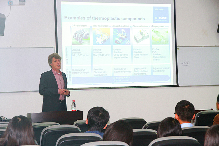Dr. Roland Hingmann 向广大师生介绍了BASF作为化工龙头企业的发展历史以及公司现阶段在工程塑料加工领域的成就和其未来的发展方向。他指出当前全球经济快速发展、人口老龄化趋势以及全球化形势正显著地影响着我们的生活,对整个化工材料市场也日益提出更高的要求。通过对聚合物加工的深刻理解以及结合企业和实验室研究的特点,Roland博士对聚合物共混技术在企业当中的典型应用做了深入剖析,与实例的结合分析也使得同学和老师对共混技术在企业中的应用有了更深入的了解。报告最后Roland博士针对研究生同学如何在毕业之后学以致用的问题,给出了一些建设性建议。他指出扎实的学术知识、开阔的视野以及优秀的团队合作是走向成功的关键因素。
