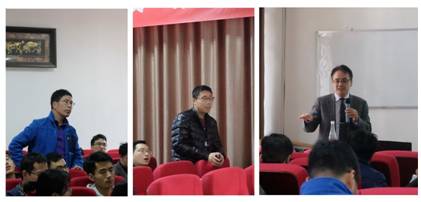 Hiroshi Jinnai教授主要从事透射电镜三维重构、电子显微镜断层扫描等领域研究。报告中,Hiroshi Jinnai教授介绍了电子显微镜在研究高分子纳米材料的3D结构及性能中的应用。通过巧妙的实验设计,利用电子显微镜能够实现对共混聚合物材料表面形貌及相关过程的研究,如利用电子显微镜研究共混聚合物材料相分离过程随时间演化的规律、稳定性及动力学。此外利用透射电子显微摄影技术对粒子进行断层扫描,能够获得相分离纳米结构或更小结构形貌的三维图像,给高分子聚合物结构的实时分析带来新的前景。报告中,吴锦荣老师、张凌老师等与Hiroshi Jinnai教授就电子显微镜在高分子聚合物结构测定中的相关科学问题进行了深入交流。通过本次学术报告交流,参会师生受益颇多。
