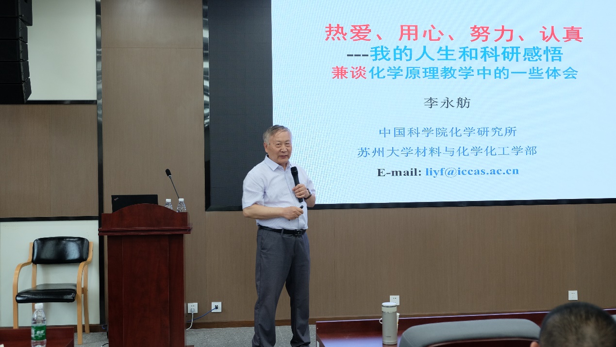 李永舫院士从他的人生轨迹出发,分享了对人生及科研的感悟和从其个人经历中总结出“热爱、用心、努力、认真”的八字箴言。李院士从“人生感悟:人生苦乐相伴”、“努力:天道酬勤”、“认真:为人“待人以诚”、做事“一丝不苟”等几个方面,分享了自己这些年在生活、教学、科研等方面的经验,李院士强调机会总是青睐有准备的人,有实力才会有机会,而实力需要我们平时的努力来铸就。最后,李院士分享了他为中国科学院大学本科生讲授《化学原理》课程过程中的体会,在授课过程中向同学灌输“热爱、用心、努力、认真”的八字箴言和人生信念,并将最新研究成果和最新工业生产现状融入教学中,引导他们真正地热爱化学。