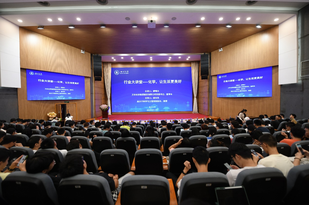 廖增太向师生介绍了万华的全球布局及6个一体化生产基地的基本信息,全面讲述了万华化学从一个集体企业逐步成为世界化工新材料50强的发展历程。他指出,“鼓励创新,宽容失败,成功重奖”,“敢想敢干,锲而不舍,没有不可能的事情”的理念是万华化学成功的秘诀。他表示,万华化学作为全球聚氨酯行业的领军企业,始终秉持 “不搞闭门造车,不做井底之蛙,开放联合搞研发”的原则,从内部管理、技术研发、人才培养等多个方面持续改革创新,以实现成为世界化工新材料行业领先企业的宏大目标。他强调,未来万华化学将围绕国家解决“卡脖子”技术和人类的可持续发展两大命题,创新突破,服务社会,全面建设世界领先化工新材料公司。