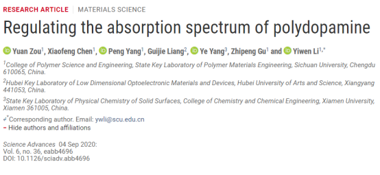 近日,番茄小说 李乙文团队联合厦门大学与湖北文理学院的研究人员在Science Advances杂志在线发表了题为Regulating the absorption spectrum of polydopamine的研究论文。提出了一种调节材料吸收光谱和光热行为的新方法,显著提升了材料对于可见/红外光的吸收能力和光热转化效率,成功获得了比天然材料更“黑”的人造黑色素与聚多巴胺材料。我校为论文第一单位,论文的第一作者为高分子学院一年级博士生邹元,通讯作者为李乙文教授。