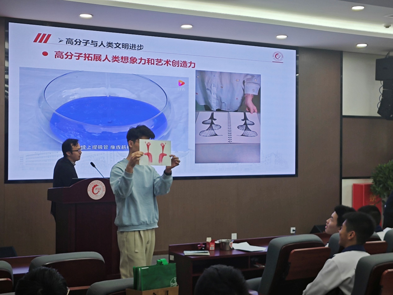 王宇研究员为同学们作了题为“浅品高分子”的科普讲座,重点介绍了高分子与地球生命起源和高分子与人类文明进步两个方面。同时,他为同学们展示了“链条喷泉”实验和用珠链在纸上通过摩擦画出不同图案的构象艺术。这一构象艺术的展示让同学们叹为观止,深切体会到了高分子科学的无穷魅力,拓展了科学视野。