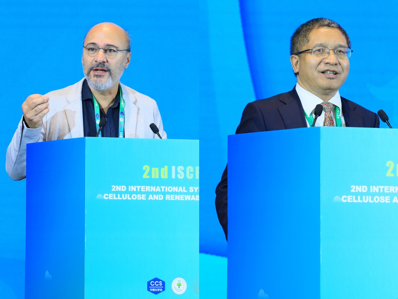 Pedro Fardim在致辞中简要介绍了European Polysaccharide Network of Excellence (EPNOE) Association(欧洲多糖协会)的发展概况和多糖作为可再生生物资源的巨大发展潜力,并指出如今人类共同面临诸多挑战,需要全球学者共同携手为美好明天努力。傅强回顾了首届国际纤维素与可再生材料研讨会的举办情况,并对本届研讨会的筹办情况和成都的特色文化作了简要介绍,他希望本次大会能够增进各国学者的交流与合作,祝愿各位代表在成都度过美好时光。