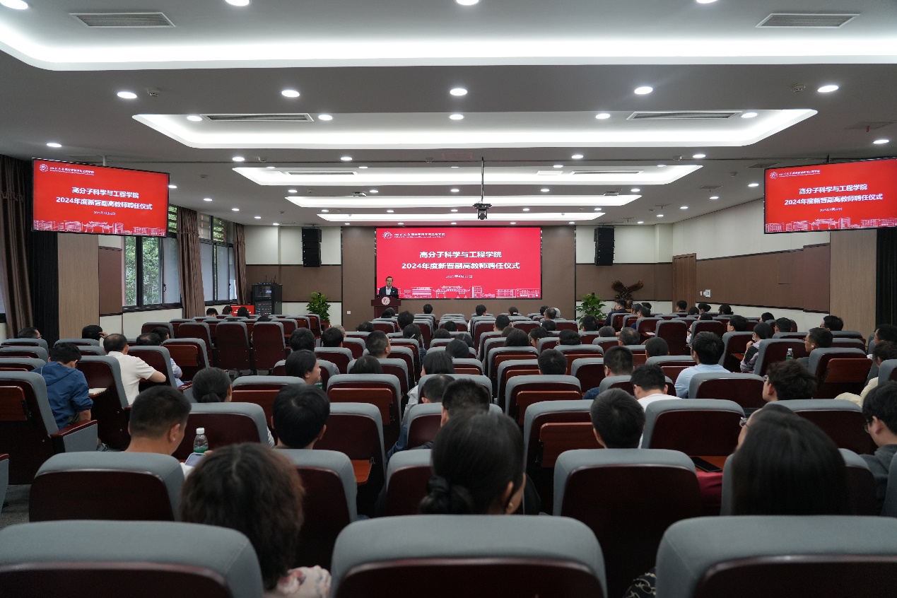 褚良银为新晋副高级专业技术职务教师颁发聘书并讲话。他代表学校向所有新晋教师表示祝贺,他指出副高级专业技术职务的取得来之不易,晋升既是荣誉也是责任;晋升教师在新的起点上,要继续努力,在人才培养、科学研究、社会服务等方面为学院、学科发展做更大贡献。同时,勉励青年教师要加强师德师风建设,传承川大高分子学科严谨治学、拼搏奋斗的精神,牢记学高为师、身正为范,在学生中发挥表率作用,时刻展现川大教师的风范。