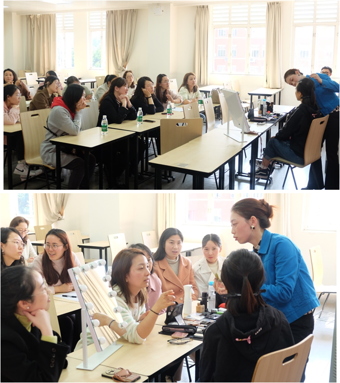 下午一点,学院特邀了专业美妆老师为教职员工们带来了一节美妆小课堂,从化妆的基本步骤到实用化妆品推荐,从化妆的细致手法到具体的实用小技巧,整个过程中专业老师耐心讲解,老师们积极参与、细致观察,活动中氛围轻松、趣味满满。