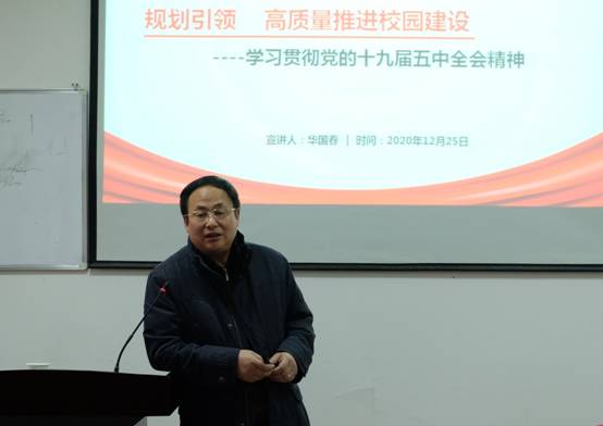 报告会上,华国春同志从十九届五中全会概况、全会及十四五规划的重要性与意义、全会主要精神等方面全面系统地解读了党的十九届五中全会精神,并结合自己的工作,详细介绍了学校十三五校园建设成就和十四五及学校中长期校园规划,使师生们对学校校园建设有了更深入的了解,同时为学院谋划十四五规划提供了思路与建议。