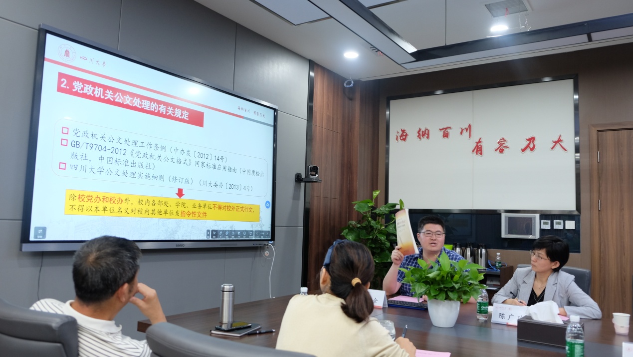 首先,李院长介绍了到场的嘉宾即学校党政办总值班室张建全主任和督查办公室陈广玲副主任,并全面介绍了学院“行政管理能力提升计划”。随后,张主任结合自身在学校党政办多年的丰富工作经验,从公文的基本语言特点、党政机关公文处理的有关规定、行文格式和常见的文种及案例分析等四个方面全面系统讲解了公文种类、规范管理、行文规则及相关要求,并结合公文写作实际和具体案例,深刻阐释了提升公文写作规范化水平的重要意义。他强调,公文写作要严格执行规范,坚持多看、多悟、多练、多改,才能提升公文写作水平。讲座结束后,与会老师与张主任进行了深入交流,现场气氛热烈。最后,李院长对讲座进行了总结,充分肯定了这次讲座的组织筹备与实效性,希望大家逐步优化思维能力,进一步提升文稿起草和公文办理质量,为助推学科“双一流”建设作出新的更大贡献。与会老师普遍认为,此次公文写作培训系统全面、内容详实、通俗易懂,对进一步提升自身文字表述、文稿撰写能力有很大帮助。