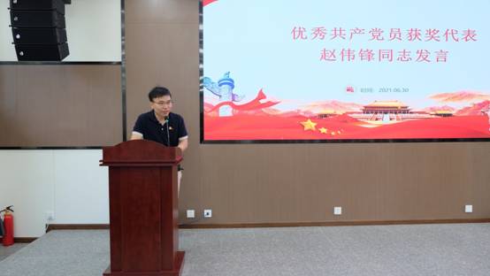 青年教师赵伟锋作为优秀共产党员获奖代表进行了发言,他表示,在川大红岩烈士江竹筠、教师楷模张桂梅、卫国戍边英雄陈红军等优秀共产党员和身边为教学科研事业默默奉献的前辈身上,学到了不怕牺牲、无私奉献的崇高精神。作为一名当代青年教师、年轻党员,只有不忘教育初心,牢记科研使命,坚持教育报国、科教兴国,传承好红色基因,才能更好地为实现中华民族复兴伟业贡献青年力量。