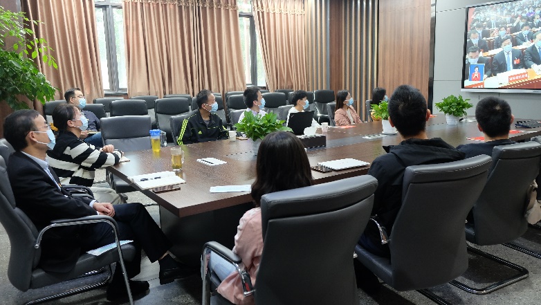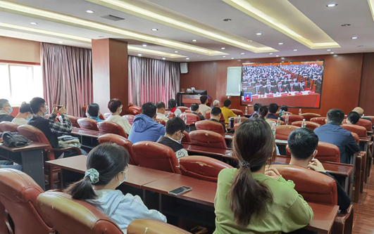 学院领导、师生代表、工会代表在科教楼207会议室收看开幕会