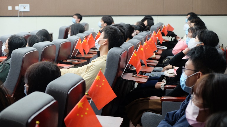 在科教楼209会议室的集中收看会场,有100余名学生党员集中观看,同学门佩戴党徽、手持国旗、认真聆听习近平总书记的大会报告,会场不时响起热烈掌声,同学们对伟大祖国的自豪感油然而生。