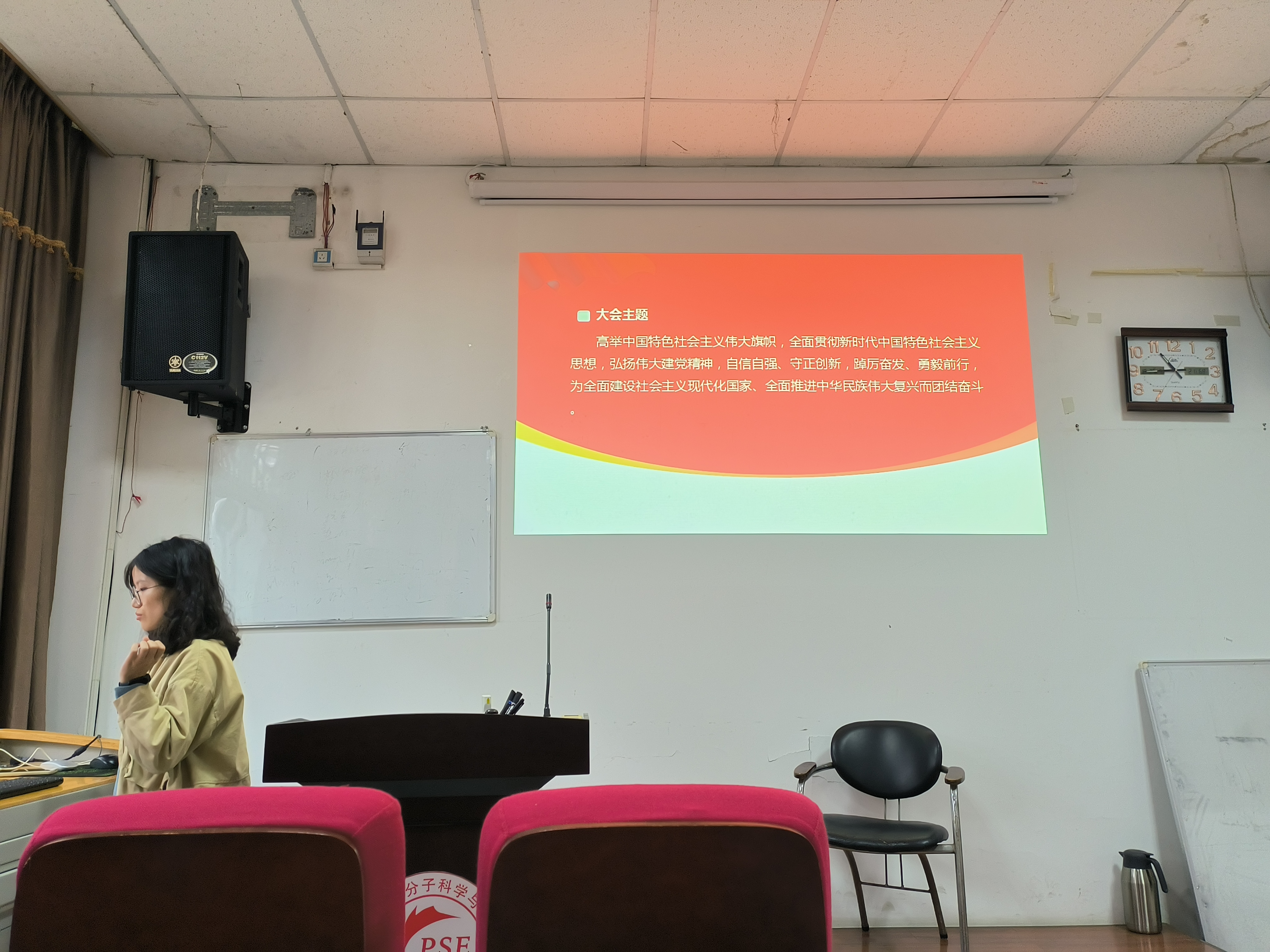 会议伊始,党支部副书记汪文洁向大家介绍党的二十大的主题,并进一步从以下三个部分展开讲述:过去五年的工作和新时代十年的伟大变革、新时代新征程中国共产党的使命任务和奋进新征程的全面部署。