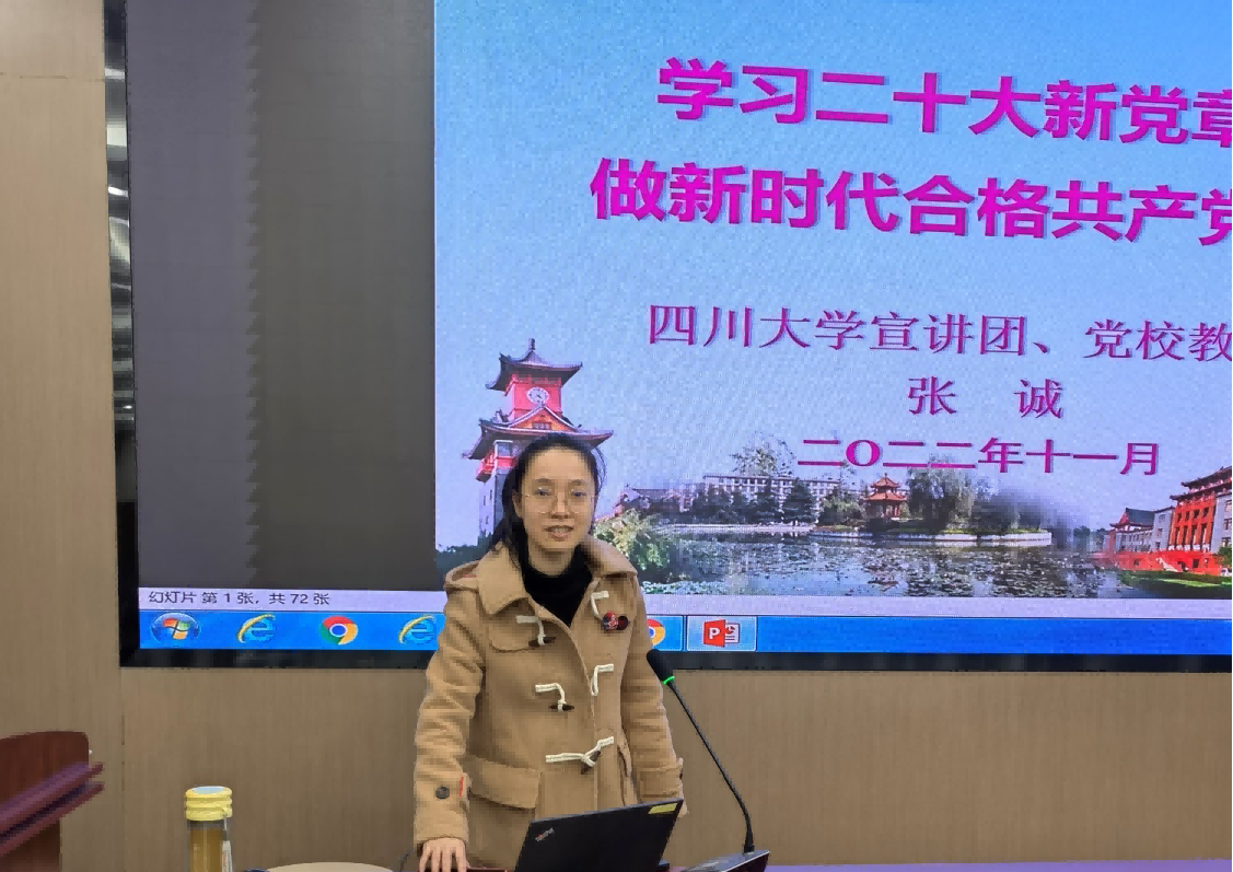 11月23日晚,校宣讲团成员、党校张诚教授在望江校区番茄小说 新科教楼209报告厅,以“学习二十大新党章,做新时代合格共产党员”为题,为该学院83名学生党员发展对象作专题宣讲报告,学院研究生辅导员黄思维同志主持了报告会。