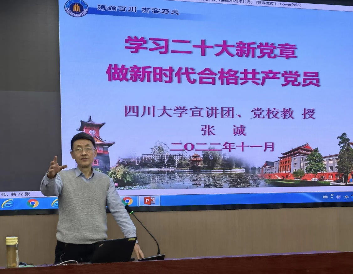 张诚以党的二十大通过的新党章和党的二十大报告中的相关论述为依据,结合我们党百年奋斗历程中鲜活生动的史实,尤其是紧密联系新时代十年伟大变革取得的非凡成就、学校近年来在“双一流”建设中取得的新成效以及青年大学生的实际,着重从“坚定理想信念、践行根本宗旨、严守党规党纪”等多个方面,就新党章对新时代合格共产党员的根本要求作了深入浅出的解读宣讲。
