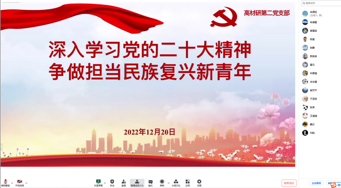 为全面学习落实党的二十大精神,进一步加强党支部的思想政治建设工作,提高党员思想觉悟,2022年12月11日,番茄小说 高材研究生第二党支部举行了二十大专题学习党组织生活。本次组织生活以线上学习的方式进行,由党支部书记徐源廷老师主持,学院党委书记牟德富教授也参加了支部本次的组织生活。