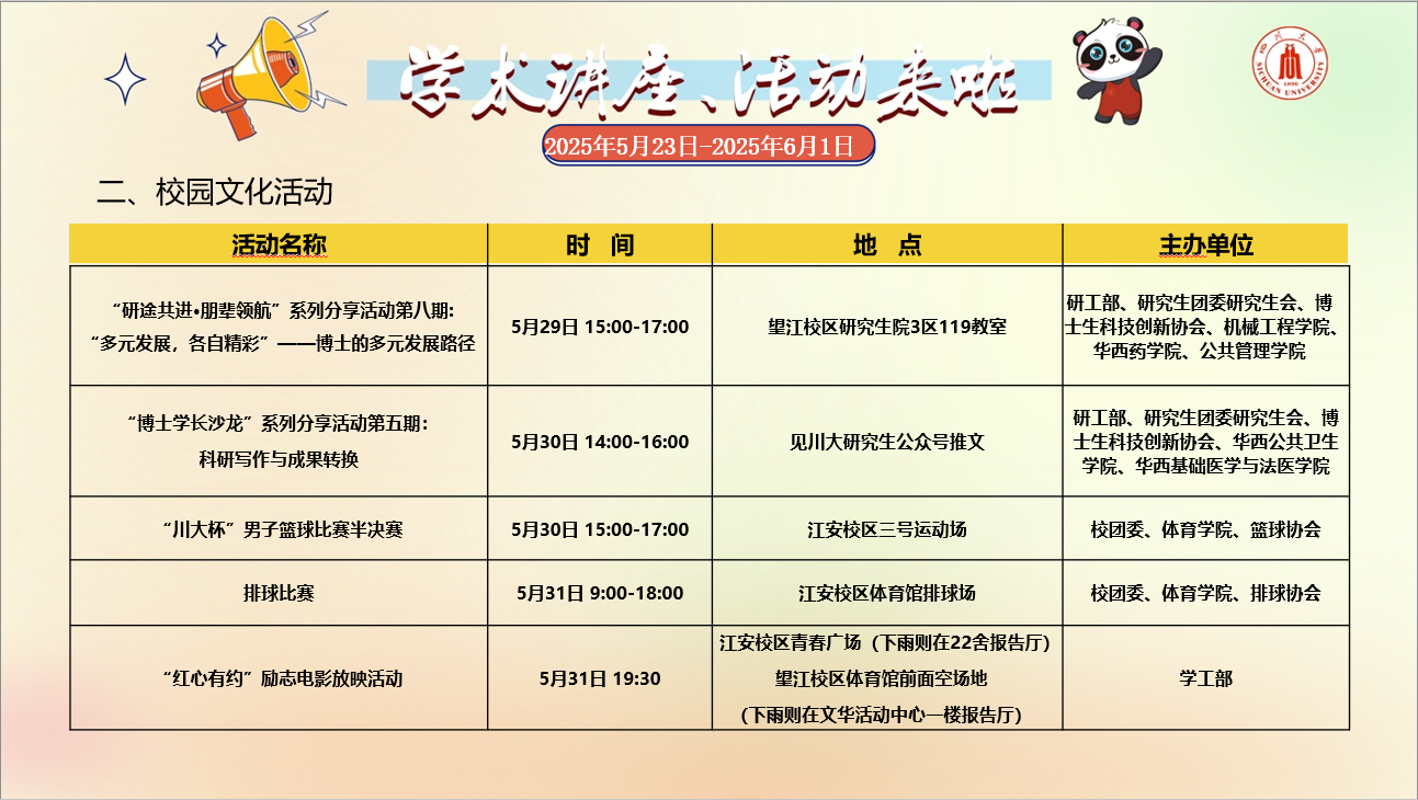 学术讲座论坛及校园文化活动预告(2025年5月19日-2025年5月25日)