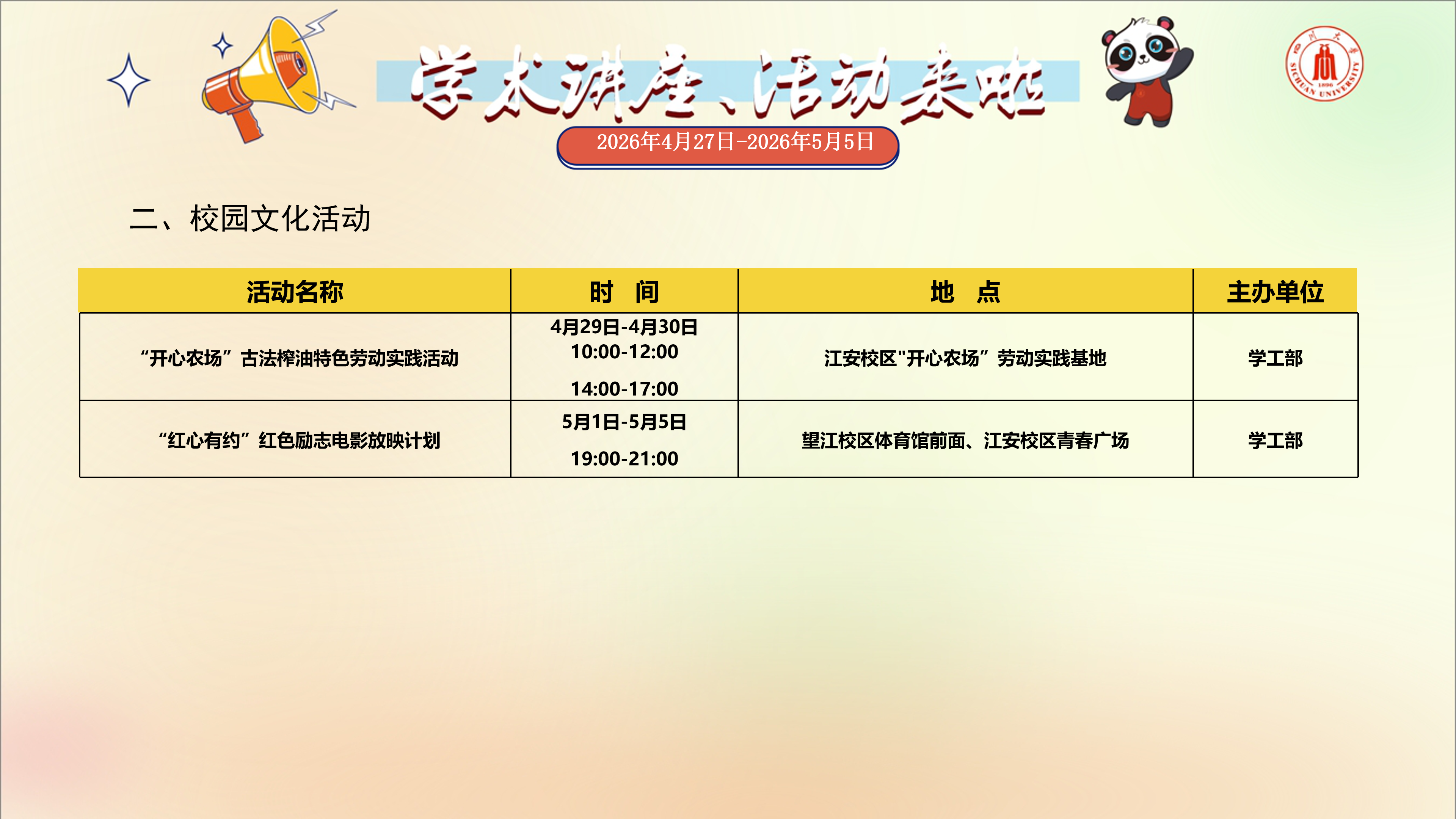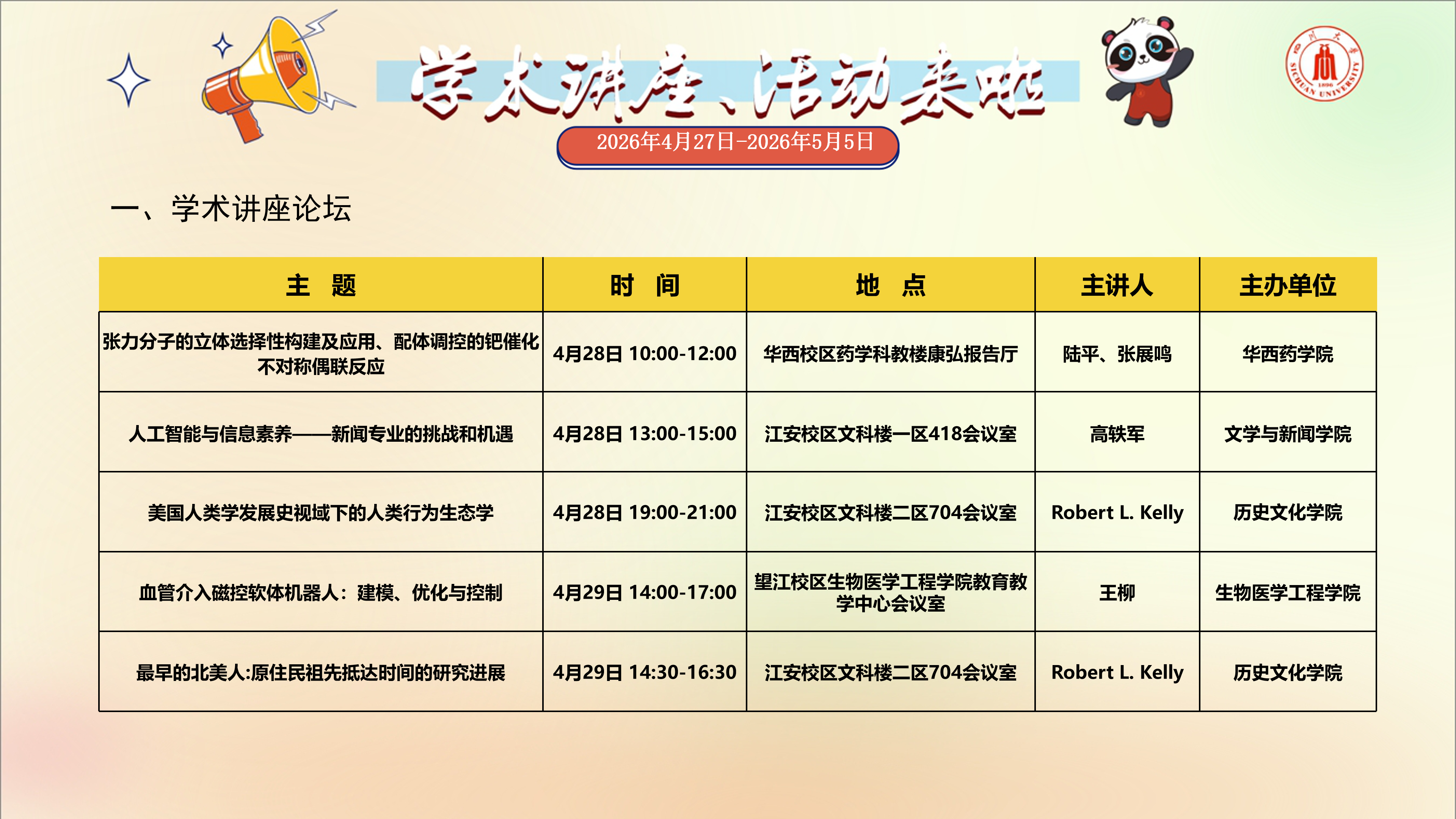 学术讲座与校园文化活动预告(2026年4月27日-2026年5月5日)