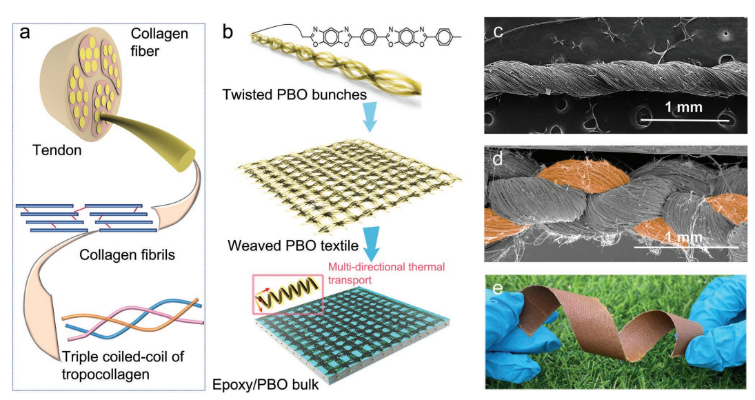 针对上述问题,团队受到胶原蛋白螺旋结构启发,通过自下而上的方式得到了一种环氧树脂/聚对苯撑苯并二恶唑纤维(PBO)块材,特殊的螺旋结构为单个纤维束单元提供了长度方向和径向方向的导热分量,而编织结构则进一步成功地将大分子低维方向的高导热性质拓展到了整个三维空间。