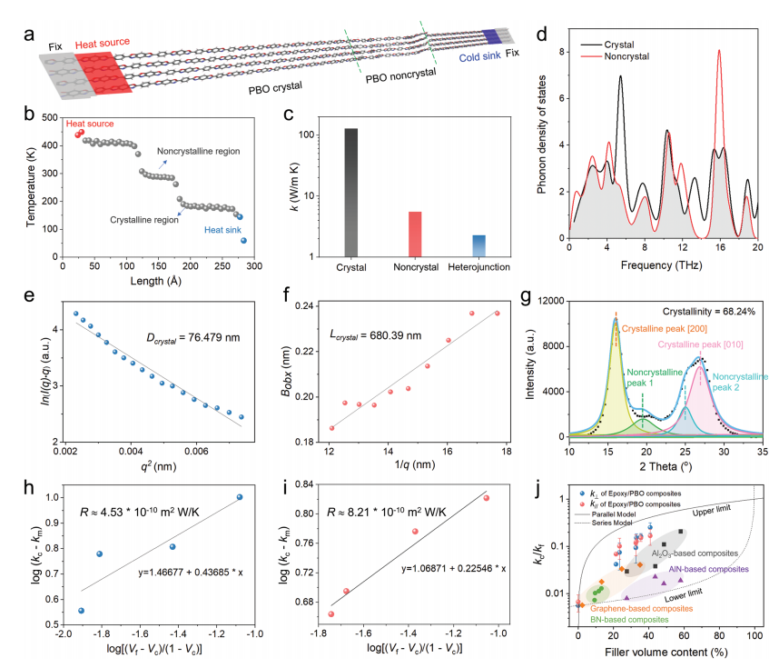同时文章结合分子动力学、声子模拟和经典的非线性导热模型,分别从分子链结构、聚集态结构、以及微观复合结构等多个方面对材料的导热机理进行了分析,提出:PBO晶区和无定形区域声子振动模式接近,因此无定形区域大分子链的连续构象就像热桥一样将相邻的晶区串联起来,在晶区和无定形区域界面处的声子散射几乎可以忽略。这也可能解释了为什么聚合物内声子平均自由程远大于其晶区尺寸、为什么经典的一维模型计算得到的PBO非晶区是高度导热的。