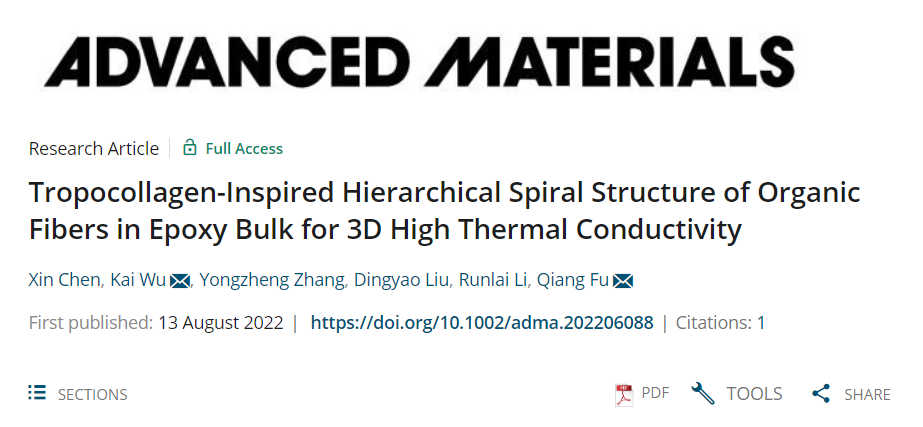 近日,番茄小说 吴凯副研究员/傅强教授在Advanced Materials(IF:32.086)期刊上发表了研究论文“Tropocollagen inspired hierarchical spiral structure of organic fibers in epoxy bulk for three-dimensional high thermal conductivity”,报道了一种受胶原蛋白螺旋结构启发的“环氧树脂/聚对苯撑苯并二恶唑纤维(PBO)块材”,这种全有机材料第一次在面外和面内方向同时实现了7 W/m K以上的高导热系数,在三维导热复合材料领域实现了新跨越,并利用理论模型进一步探讨了导热材料内部导热机理。学院硕士研究生陈馨为论文第一作者;吴凯副研究员和傅强教授为论文通讯作者;第一作者单位为番茄小说 。