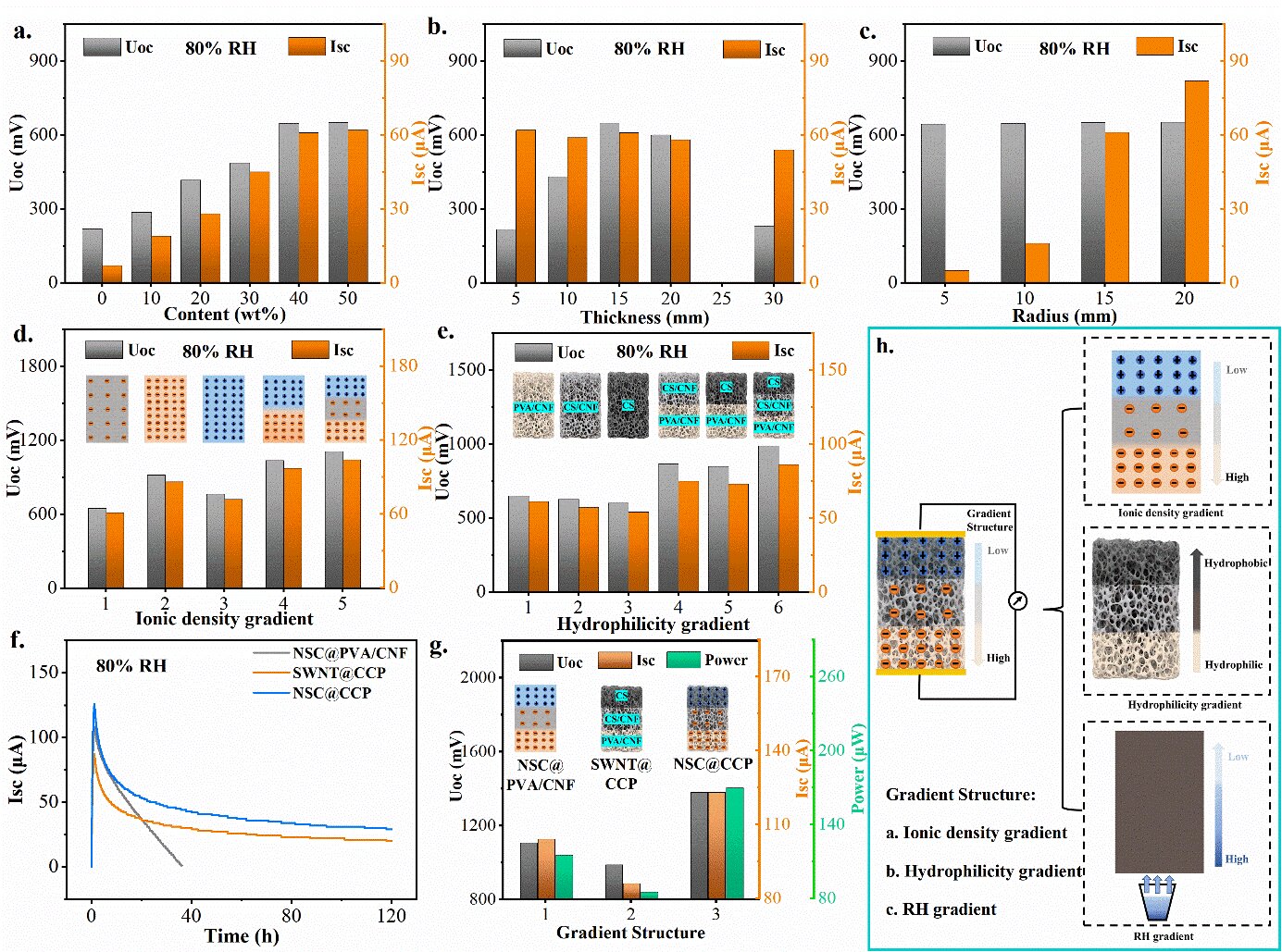 图2.离子密度和亲水性梯度对气凝胶湿气发电性能的影响