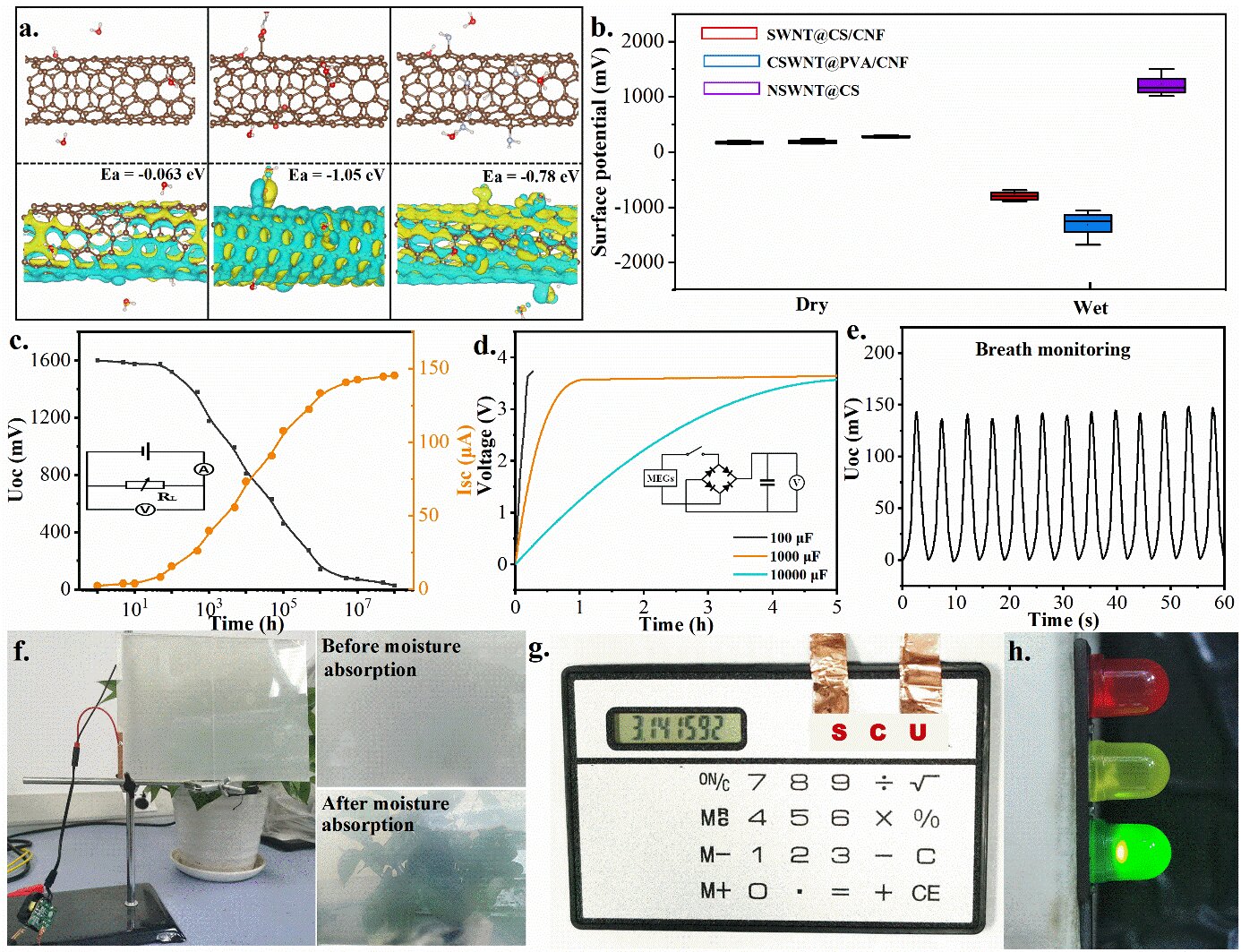 如今,为缓解化石燃料造成的能源危机和环境污染,绿色可再生能源(如太阳能、水电和风能)的研究发展迅速。然而,受气候、地理和设备尺寸的限制,上述能量路由器在设备小型化和实际应用方面仍然存在显著的局限性。如果自然界和生活过程中无处不在的潮湿空气能够诱导发电,这将大大扩大可持续的电力来源。湿气发电机(MEGs)利用水分子和活性材料之间的相互作用产生流动潜力,展示了绿色、可再生和便携的优势。但受限于输出功率的限制,MEG的开发和实际应用仍然面临巨大挑战。