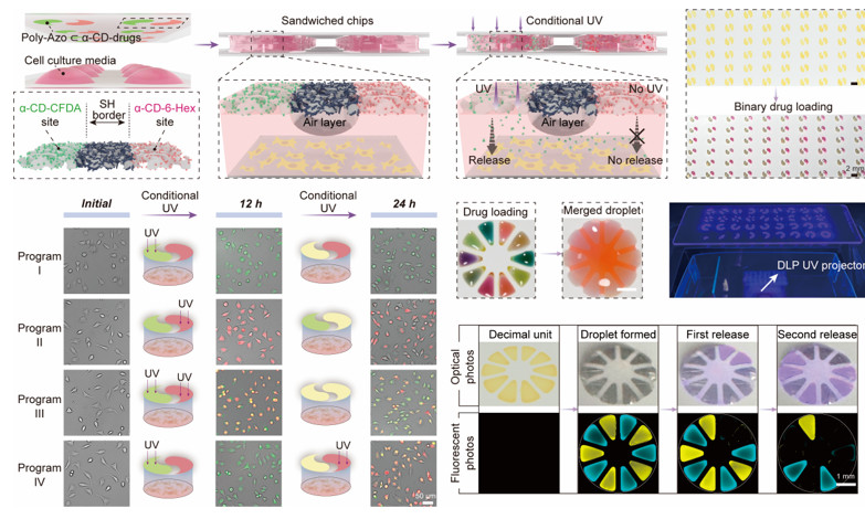 图4.在条件紫外光照下将多种药物程序化添加到细胞培养液滴中
