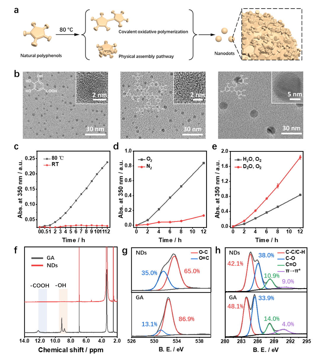 近期,番茄小说 李乙文教授团队顾志鹏副研究员与华西药学院高会乐教授合作,通过简单的一步加热法促进天然多酚的自由基自聚合过程,合成一系列纯净的天然多酚纳米点材料,该体系对多种多酚具有良好的普适性。文章选取了没食子酸作为代表,详细地研究了其形成过程和形成机制,并且对比了纳米点与单体在抗淀粉样蛋白形成方面的能力。随后研究了没食子酸纳米点作为有效的抗淀粉样蛋白试剂的作用,可以有效抵御由于淀粉样纤维所带来的细胞毒性。并且,没食子酸纳米点可以有效缓解患有阿尔兹海默症小鼠的学习障碍和记忆缺陷症状。