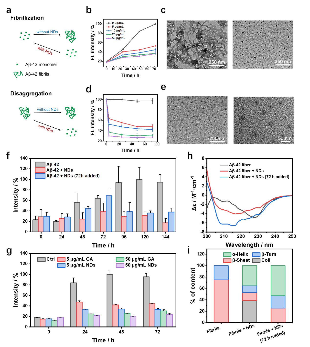 图3天然多酚纳米点(没食子酸纳米点)抑制Aβ-42 纤维化与分解 Aβ-42 纤维研究