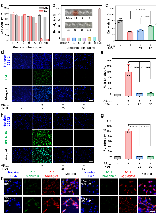 细胞实验数据表明,天然多酚纳米点具有很好的细胞相容性,在细胞水平上可以有效抑制Aβ-42 纤维化,不仅如此,天然多酚纳米点具有很好的自由基清除能力,对于疾病引起的氧化应激有很好的恢复作用。在动物实验中发现,天然多酚纳米点可以有效清除小鼠脑部的Aβ-42蛋白含量,并且有效缓解转基因小鼠体内的氧化应激症状,并在后续的一系列机理研究中证实了天然多酚纳米点可以通过抑制Aβ纤维化与分解Aβ纤维来改善阿尔兹海默症的症状。