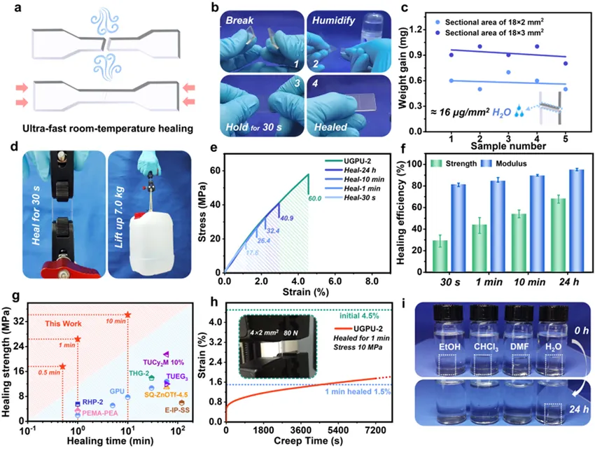 UGPU具有优异自修复能力,其在受压下可以实现玻璃态自修复。同时,研究人员发现,极其微量的水分(16 μg/mm2)作用于UGPU的断面,即可以显著加速修复速度(图2),使UGPU在一分钟内恢复26.4 MPa的抗拉强度和超过80%的杨氏模量,这创下了自修复材料的历史记录。而且修复后的样品可抵抗10 MPa的蠕变测试,足以满足结构件受损后快速修复并继续服役的应用需求。