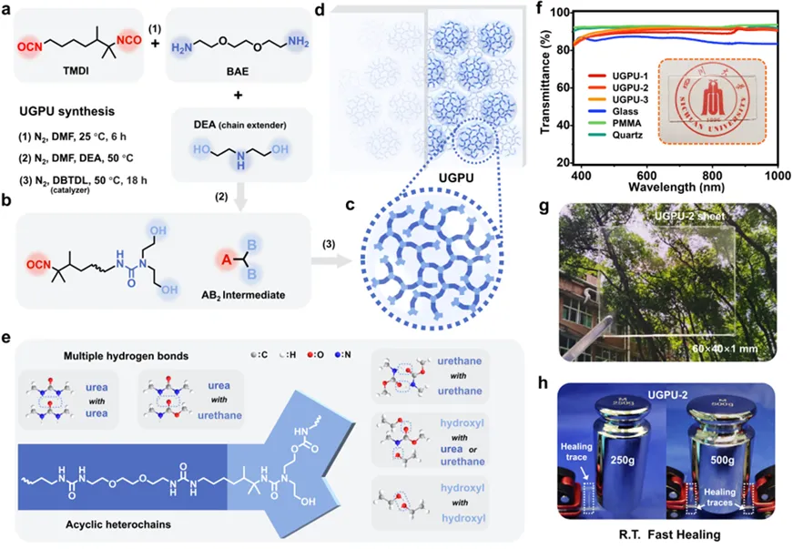 近日,学院吴锦荣教授团队报道了一种室温下能快速修复的玻璃态超支化聚氨酯(UGPU)。在这项工作中,研究人员通过偶联单体法反应得到了具有无环杂原子链和超支化结构的聚氨酯材料(图1)。这种独特的分子结构将超支化聚合物的高分子运动性与聚氨酯的多重氢键相结合,构成了基于脲键、氨基甲酸酯键和支化末端羟基的高密度氢键网络。UGPU的拉伸强度高达70 MPa,储能模量2.5 GPa,玻璃化转变温度远高于室温(53 ℃),因此,UGPU是一种刚性的透明玻璃态塑料。