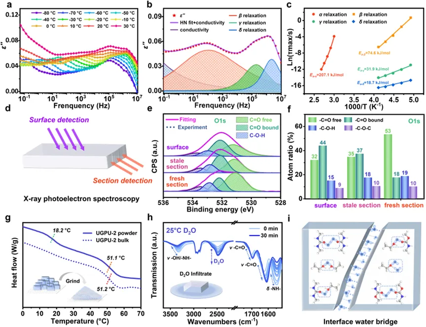 为了揭示UGPU的快速修复的机理,研究人员通过宽频介电松弛谱、X射线光电子能谱、二维红外光谱、时间相关红外光谱和显微红外光谱等一系列手段,解析UGPU超快速修复的内在机制(图3),该机制主要体现在:
