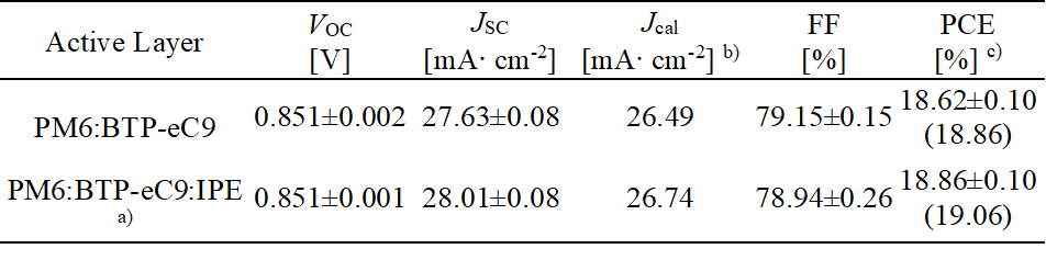 a)IPE的浓度为 1.5 mg·mL-1. b)根据EQE进行积分,Jcal和JSC之间的不匹配程度分别为4.1%和4.5%。 c)括号内数值为10个独立器件的平均值。