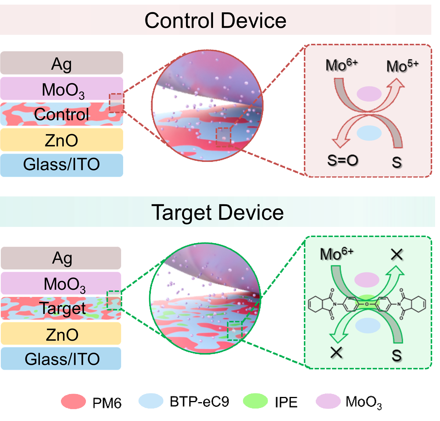 在不含IPE 的情况下,高温条件下 MoO₃ 会氧化 BTP-eC9 分子中的硫原子,生成 O=S=O 结构;引入 IPE 后,该氧化产物的比例由 34.7% 降低至 9.0%。