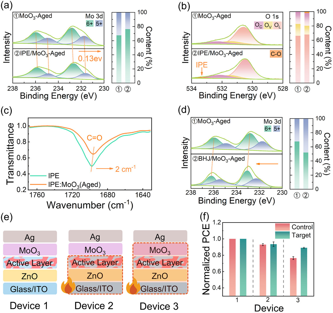 图3.(a) MoO3及IPE/ MoO3样品(均在170°C热处理5小时)的Mo 3d核心能级高分辨率XPS谱图。(b) 上述样品的O 1s核心能级高分辨率XPS谱图。(c) IPE粉末及其与MoO3混合物在老化后,在约1700 cm⁻¹处C=O伸缩振动区域的傅里叶变换红外光谱详图。(d) MoO3及活性层/ MoO3样品(均在170°C热处理5小时)的Mo 3d核心能级高分辨率XPS谱图。(e) 应用于器件的三种热处理策略示意图。(f) 每种热老化条件下归一化光电转换效率的演变。数据表示为平均值±标准差(n = 5)。