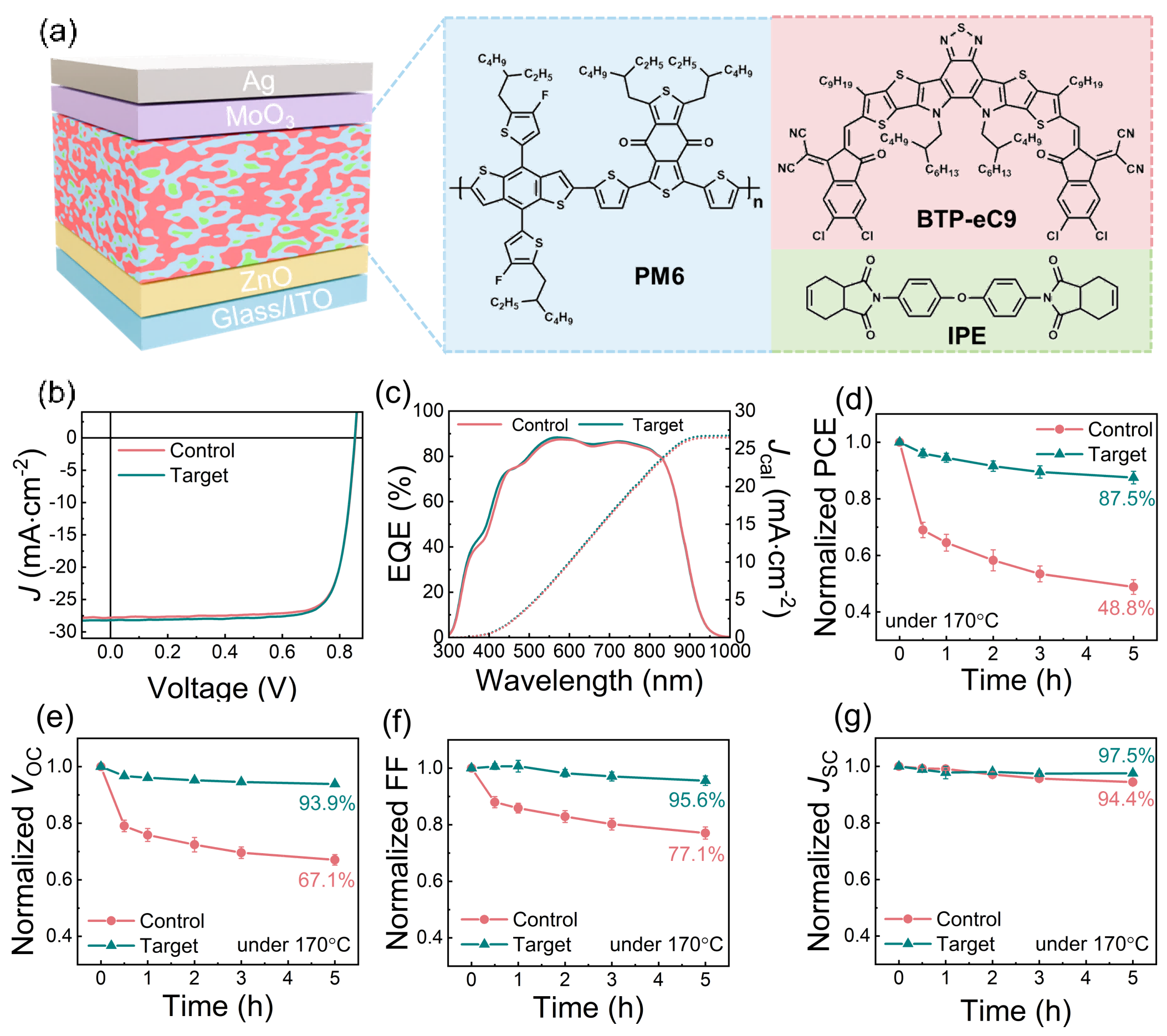 图1.(a)器件结构示意图及 PM6、BTP-eC9 和 IPE 的分子结构式。(b) 含与不含IPE 的器件电流密度–电压(J–V)特性曲线。(c) 相应器件的外量子效率(EQE)光谱。(d-g) 在170°C热老化过程中器件关键光伏参数的演变:(d) 光电转换效率,(e) 开路电压,(f) 填充因子和 (g) 短路电流密度。数据以平均值±标准差表示(n = 3-4)。