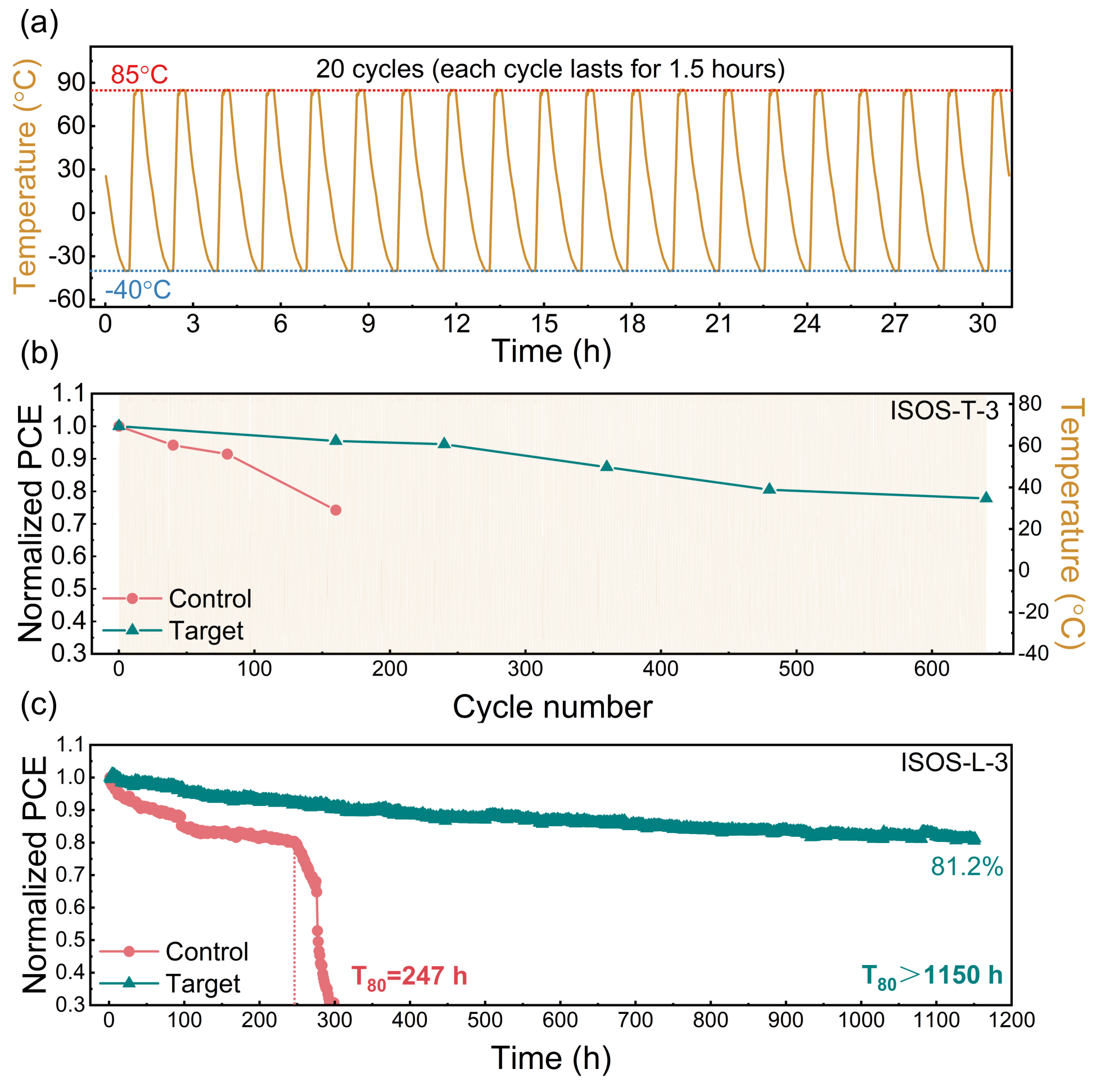 图2. (a) 热循环过程中温度随时间变化的曲线(展示20个循环,每个循环约1.5小时)。(b) ISOS-T-3协议下的器件归一化光电转换效率保持率:在约60%相对湿度下,于-40°C和85°C之间进行热循环。卡其色阴影区域指示热循环期间的温度同步变化。(c) ISOS-L-3条件下(65°C、约50%相对湿度、1个太阳光照)在最大功率点跟踪测试的运行稳定性。