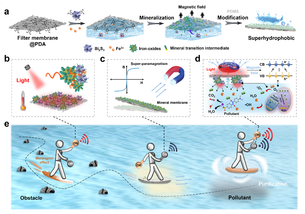 界面漂浮机器人在载体、环境监测、水处理等领域有着广阔的应用前景。无线漂浮运动通过光、磁场、化学燃料和气动力等多种推进策略来实现。其中,光热Marangoni驱动具有响应快、成本低、环保等优点,同时超疏水特性可以降低运动过程中液/固界面之间的阻力。然而,此类水上机器人面临着两大挑战:(1)缺乏高效可控性,如极快的响应、高速的驱动行为、宽泛的表面张力适用性等;(2)长期使用中的环境适应性被忽视。虽然超疏水特性...