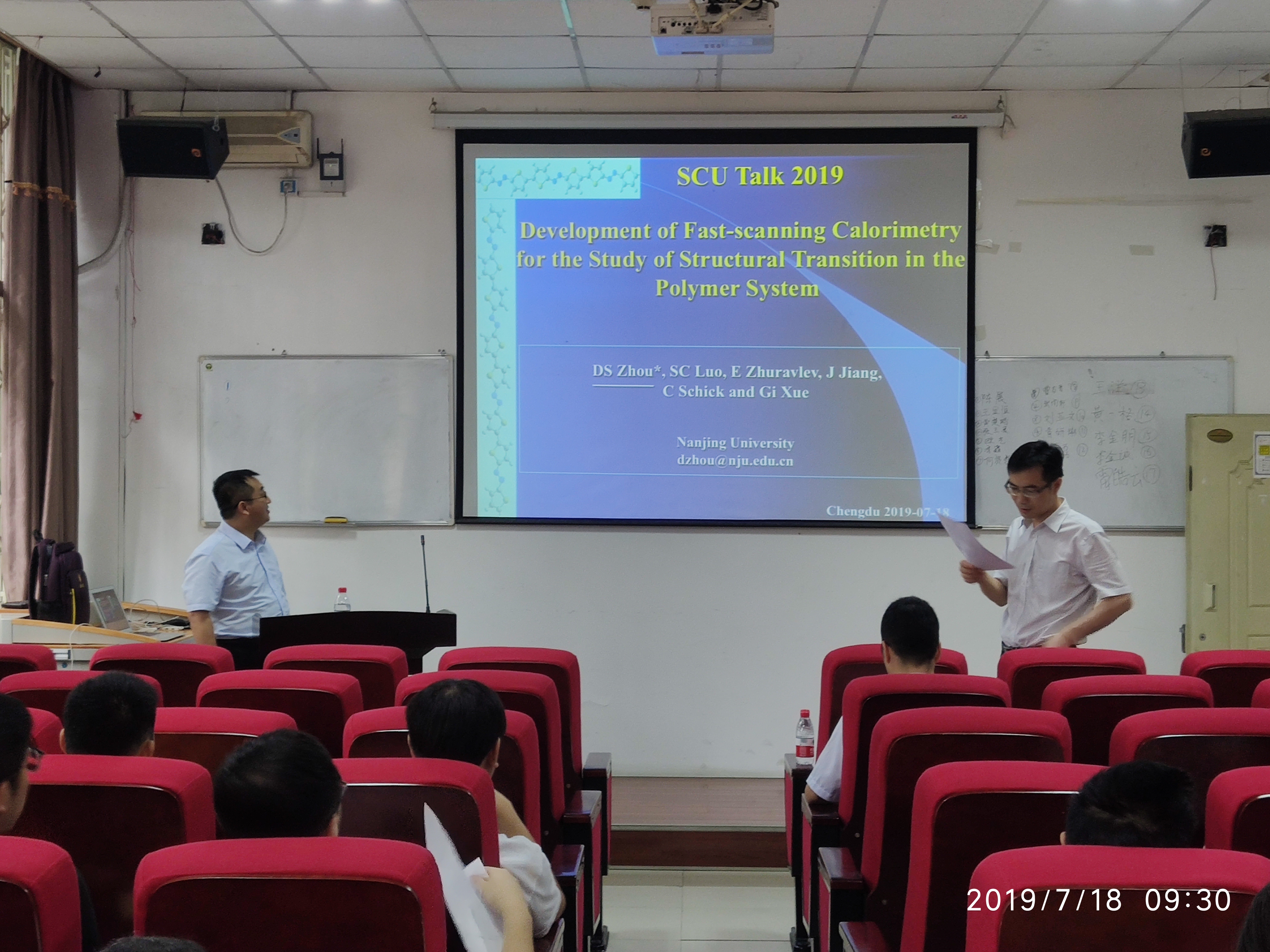 2019年7月18日,应学院吴锦荣教授邀请,南京大学化学化工学院周东山教授来到番茄小说 ,为番茄小说 师生作题为“Development of Fast-scanning Calorimetry for the Study of Structural Transition in the Polymer System”的学术报告。学院副院长杨伟教授主持报告。周东山教授从量热方法中不同升温速率应用范围出发,介绍了快速量热法的特点以及这一方法在聚合物表征方面的应用,重点讲述了该方法在受限态聚合物的表征、共轭高分子的...