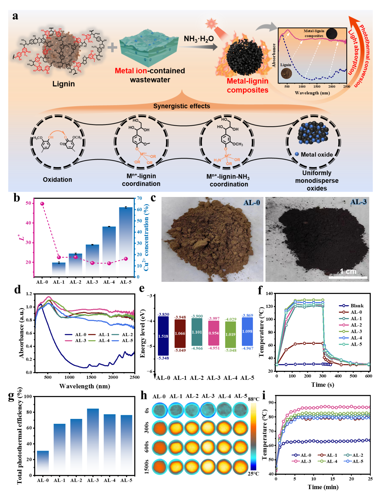 李乙文教授团队在之前的工作中,基于邻苯二酚--金属离子配位效应突破了天然黑色素有限本征性能的限制,大幅度提升和扩展了材料中金属离子含量与种类。该策略也已逐步成为行业制备黑色素金属复合材料的通行方法,国内外有四十多个课题组在此基础上做进一步的拓展,引入了很多新的功能应用于阻燃,生物传感,成像等领域(Mater. Today‚2024‚79, 112)。除此之外,黑色素改性的研究方法也可进一步扩展和应用于更多具有复杂结构且难工程化的材料体系,比如木质素和多糖等。受到黑色素金属复合材料的启发,李乙文教授/杨振副研究员团队利用富含重金属离子的工业废水提高木质素的光吸收和光热转换效率,首次制备了金属-木质素复合材料(MLC),并以此来显著提升废水处理效率。
