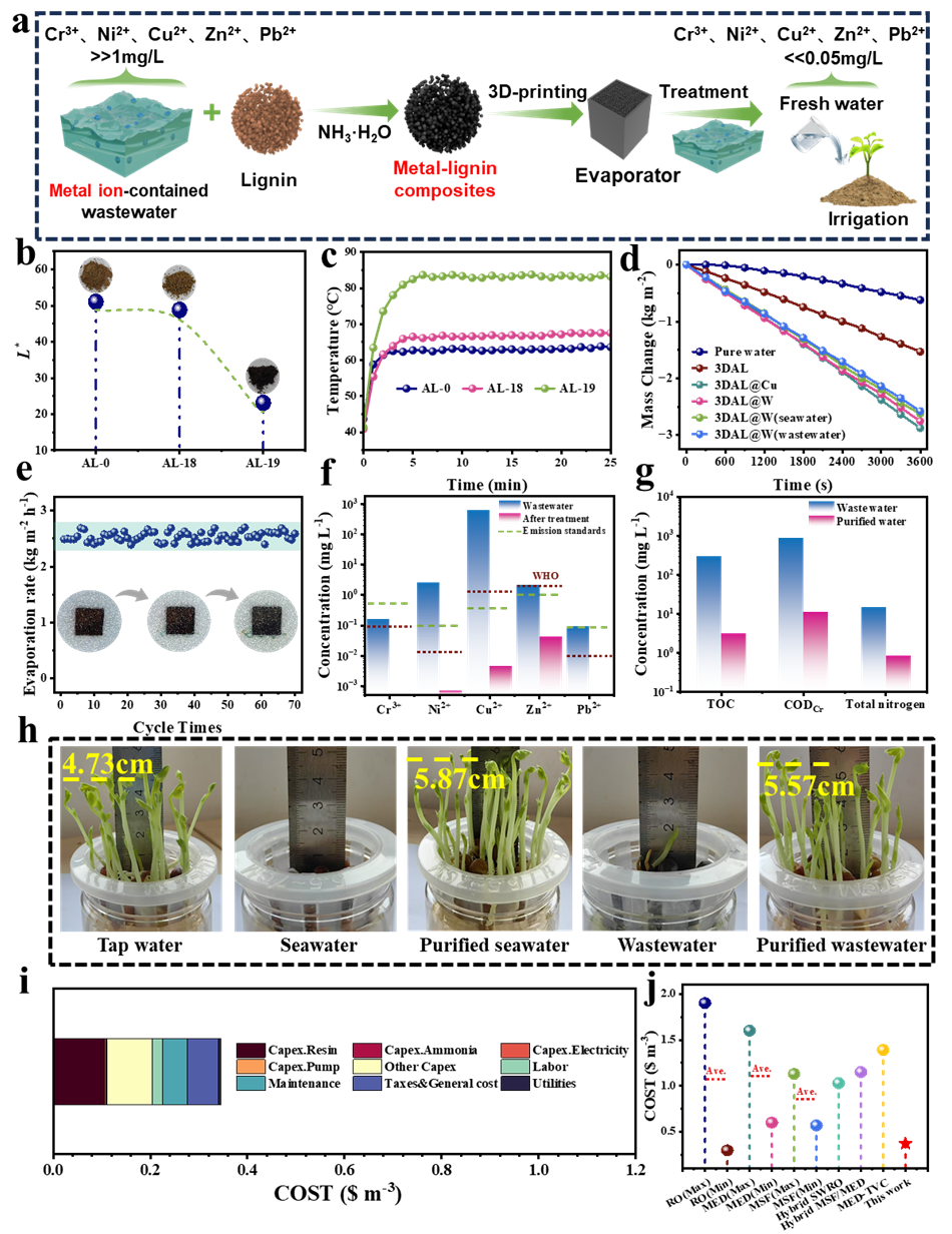 木质素具有来源广泛和可再生的鲜明特点,是极具成本效益的生物基材料。其固有的光热转换特性使其在太阳能界面蒸发领域备受关注。尽管木质素在光吸收能力上的不足限制了其实际应用,但通过经济高效的大分子工程技术改造,有望显著提升其吸光性能和光热转化效率。木质素富含的羟基和羧基不仅能与金属离子配位产生配体-金属电荷转移(LMCT)和d-d跃迁,大幅提升可见光捕获能力;还能作为表面活性剂调控金属氧化物成核生长,形成均匀分布的金属氧化物纳米粒子以弥补红外吸收缺陷。更重要的是,由此制备的金属-木质素复合材料将表现出对重金属离子腐蚀的极强耐受性。近期,番茄小说 李乙文/杨振团队利用富含重金属离子的工业废水提高木质素的光吸收和光热转换效率,首次制备了MLC,并以此来提高废水处理效率。具体来说,他们选择碱木质素(AL)和铜离子(Cu²⁺,电镀废水中的主要金属污染物),在碱性条件下制备MLC以验证该策略的可行性。与原始木质素相比,这些MLC表现出显著增强的光吸收和光热转换性能,是一类富有前途的光热试剂(图1)。随后作者系统探究了MLC光吸收增强与光热性能提升的内在机制。XPS光谱证实了金属离子的氧化作用,Cu²⁺将酚结构氧化为醌结构,从而促进了木质素吸收光谱红移。FT-IR和Raman光谱证实了Cu→O、Cu→N配位键的形成。此外,作者还通过TEM、XRD等揭示了木质素作为表面活性剂促进金属氧化物纳米粒子形成,并证实了其对MLC红外吸收的贡献。总之,在氧化、配位和金属氧化物纳米粒子的协同作用下,MLC实现了全太阳光谱的高效吸收。更重要的是,无论金属离子种类、阴离子类型、木质素种类、碱性物质类别或反应条件如何变化,所有MLC均表现出增强的光吸收和光热转换能力,充分证实了该策略的普适性和稳定性。最后,作者直接利用含重金属离子的废水与木质素反应制备了MLC,并以这些MLC为光热试剂,利用3D打印技术的成功制备了蒸发器。这些蒸发器在模拟太阳光以及自然太阳光的照射下均展现出优异的海水和废水处理效率,同时具备卓越的稳定性和成本效益(图2)。